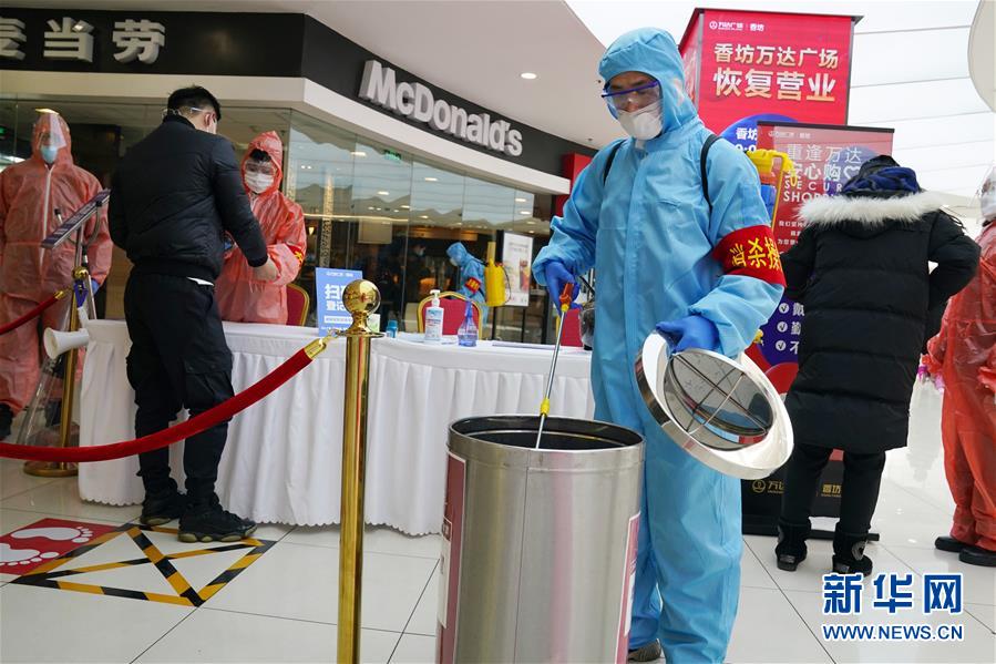 3月13日,在哈爾濱香坊萬達廣場內(nèi),工作人員在給垃圾桶消毒。 近日,哈爾濱市多家大型商場陸續(xù)恢復(fù)營業(yè)。這些恢復(fù)營業(yè)的商場采取多種措施,從嚴細致做好疫情防控和安全風(fēng)險防范工作,為廣大顧客提供安全放心的購物空間。 新華社記者 王建威 攝