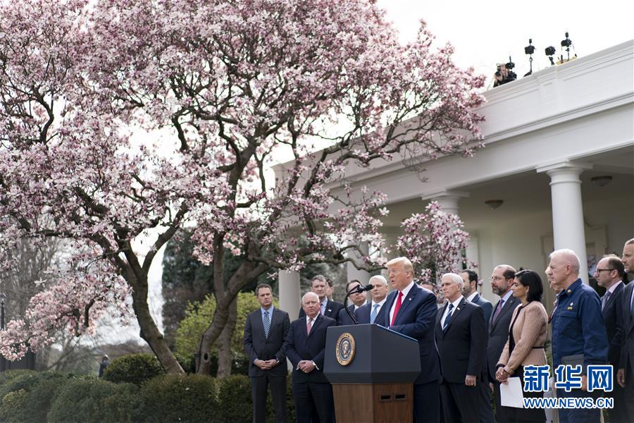 3月13日,美國總統(tǒng)特朗普(中)在華盛頓白宮的記者會上講話。特朗普當天下午在白宮發(fā)表講話時正式宣布“國家緊急狀態(tài)”。他說,此舉旨在讓美國聯(lián)邦政府全力投入到抗擊新冠肺炎疫情的努力中。這項舉措將釋放500億美元資金,幫助各州和地方政府應對疫情。新華社記者劉杰攝