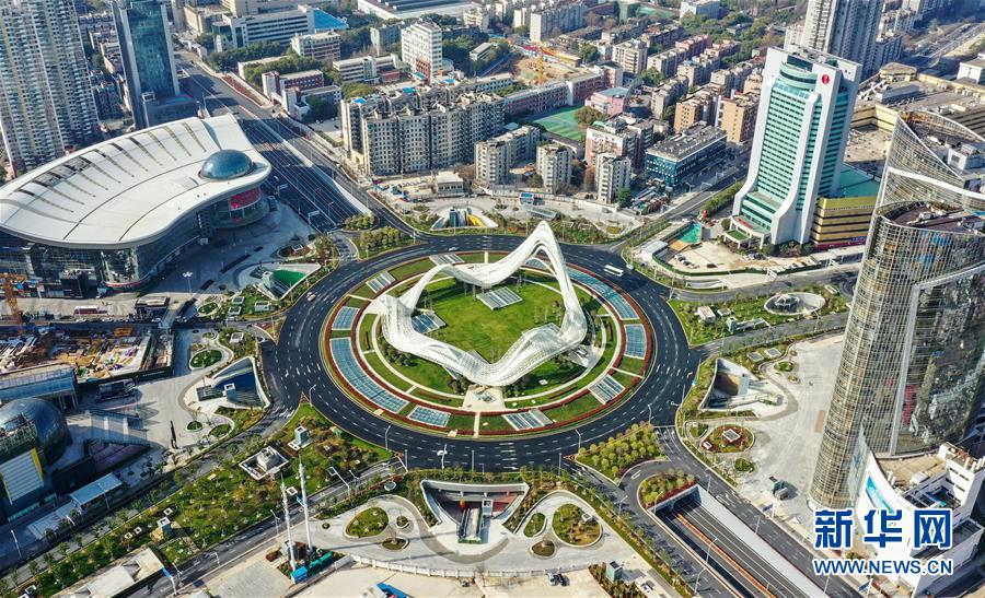 這是3月15日拍攝的武漢光谷廣場(無人機照片)。 3月15日,江城武漢天氣晴好,整個城市沐浴在和煦的春光中。 新華社記者 李賀 攝