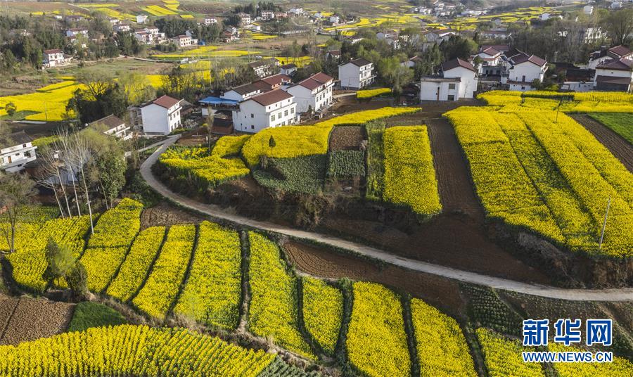 3月14日,洋縣龍亭鎮(zhèn)柳山村盛開的油菜花與村舍構(gòu)成美麗的圖畫(無(wú)人機(jī)照片)。 新華社記者陶明攝