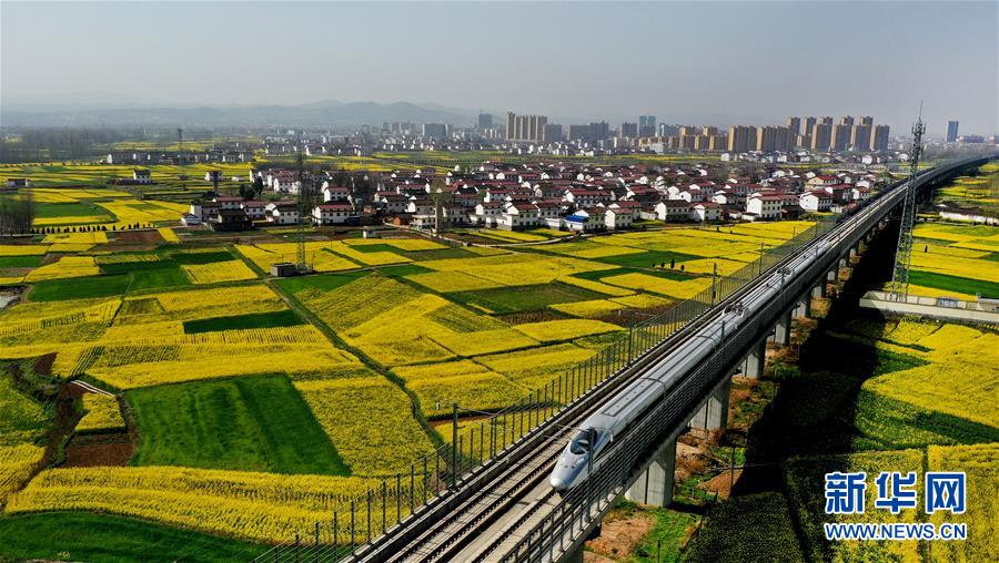 3月14日,一列動(dòng)車從洋縣油菜花海中駛過(guò)(無(wú)人機(jī)照片)。 新華社記者陶明攝