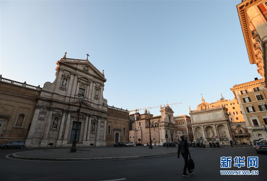 3月16日,在意大利首都羅馬,一名男子戴著口罩走過廣場(chǎng)。新華社記者程婷婷攝