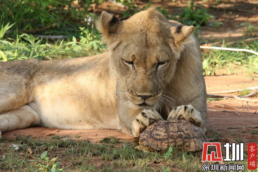 肯尼亞獅子捉了只烏龜當(dāng)“零食” 啃不到肉肉好生氣!