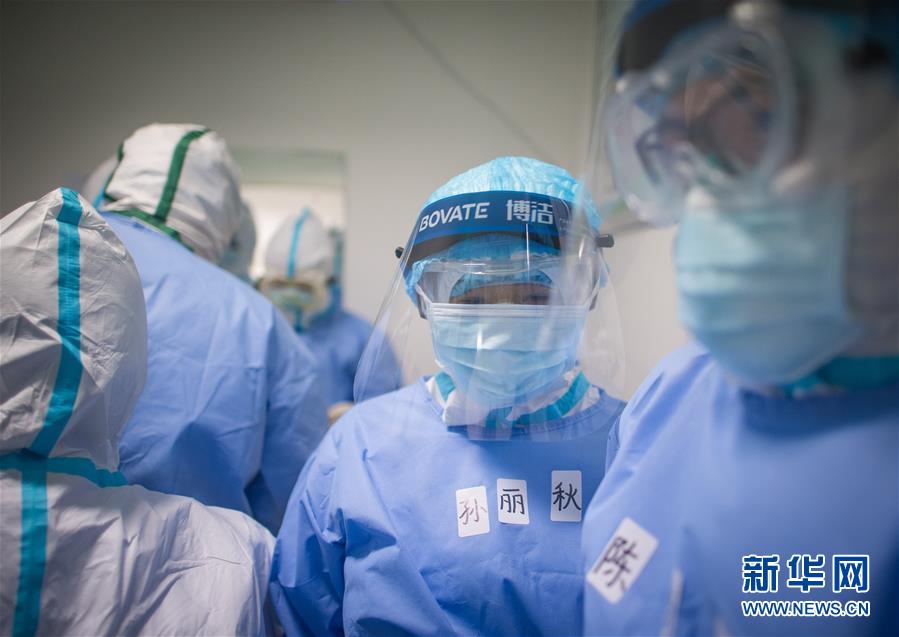 3月19日,在武漢市肺科醫(yī)院清潔區(qū),浙江醫(yī)療隊隊員孫麗秋(中)在穿戴防護(hù)服。 新華社記者 肖藝九 攝