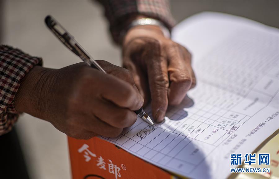 抵達(dá)魯?shù)榭h卯家灣易地扶貧安置區(qū)的王大香在領(lǐng)取新家鑰匙的名冊(cè)上簽下丈夫的名字(3月15日攝)。 新華社記者 江文耀 攝