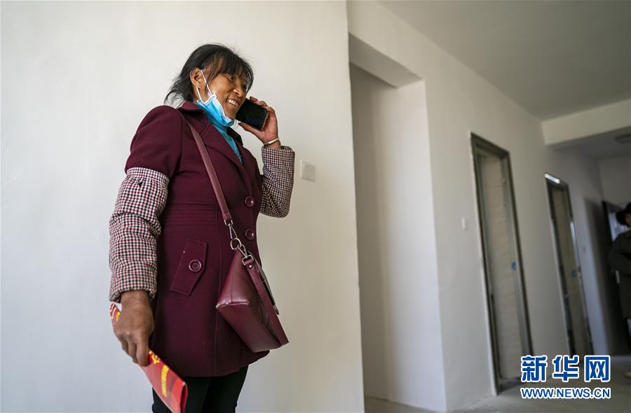 第一次進(jìn)到新家的王大香給親戚們打電話報喜(3月15日攝)。 新華社記者 江文耀 攝