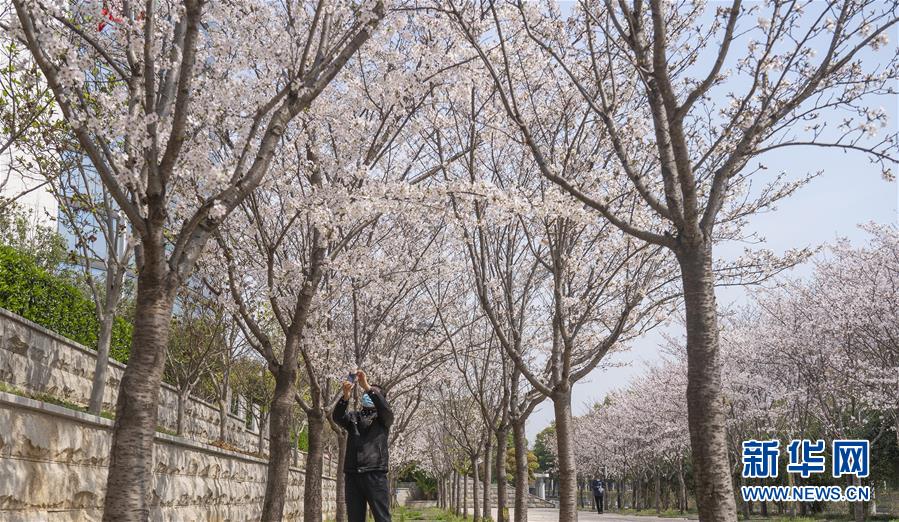 3月19日,在武漢市武昌區(qū)被網(wǎng)友稱為“武漢最美停車場”的湖北日報停車場,一名工作人員在拍攝櫻花。 新華社記者 才揚(yáng) 攝