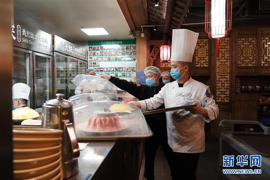 3月21日,在四川省成都市的一家火鍋店,工作人員準(zhǔn)備上菜。近日,在做好新冠肺炎疫情防控措施的基礎(chǔ)上,四川省成都市的火鍋店逐漸恢復(fù)營業(yè)。新華社記者李夢(mèng)馨攝