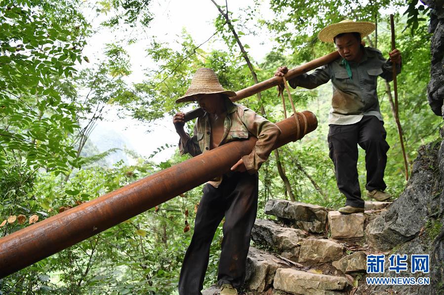 在廣西大化瑤族自治縣板升鄉(xiāng)弄雷村,工人們抬著抗旱飲水工程的水管在山路上前行(2016年8月10日攝)。廣西有近一半貧困人口生活在石漠化地區(qū),涉及數(shù)十個縣區(qū)。這里也是廣西飲水保障程度最低的地區(qū),解決貧困人口飲水問題是廣西脫貧攻堅戰(zhàn)“硬仗中的硬仗”?!笆濉币詠恚瑥V西加快實施農(nóng)村飲水安全鞏固提升工程。因地制宜,采取新建、擴(kuò)建及管網(wǎng)延伸等多種措施,補(bǔ)齊貧困地區(qū)水利薄弱短板,進(jìn)一步提升石漠化地區(qū)群眾飲水安全保障水平,助推脫貧攻堅。新華社記者黃孝邦攝