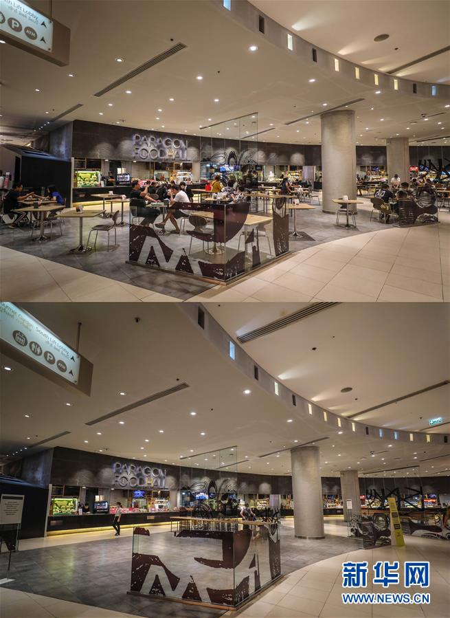 這是3月21日拍攝的泰國(guó)曼谷暹羅百麗宮商場(chǎng)負(fù)一層的美食城(上圖)和3月22日拍攝的美食城對(duì)比圖。商場(chǎng)除了負(fù)一層的美食城和超市外,全部關(guān)閉。美食城只對(duì)顧客提供外賣(mài)服務(wù)。新華社記者張可任攝