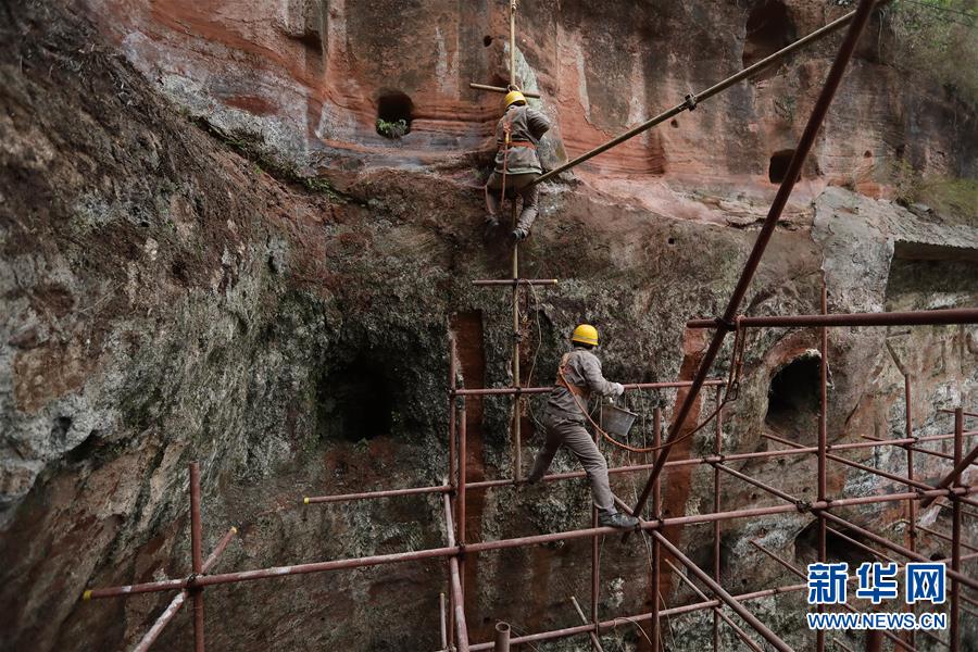 中鐵西北科學(xué)研究院有限公司文保中心的工作人員對大佛巖體進行保護性清理(3月17日攝)。新華社記者江宏景攝