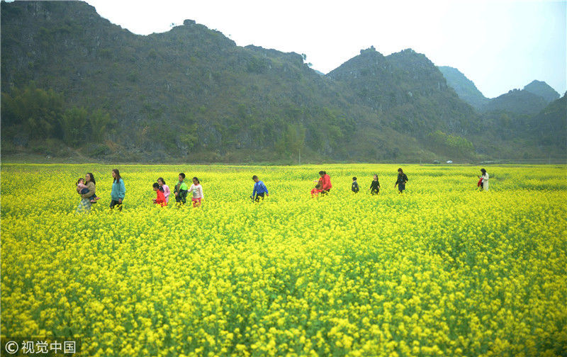 2019年2月5日,廣西來賓,當(dāng)天是農(nóng)歷大年初一,人們?cè)谛贸强h城關(guān)鎮(zhèn)隆光村油菜花海中賞花游玩。