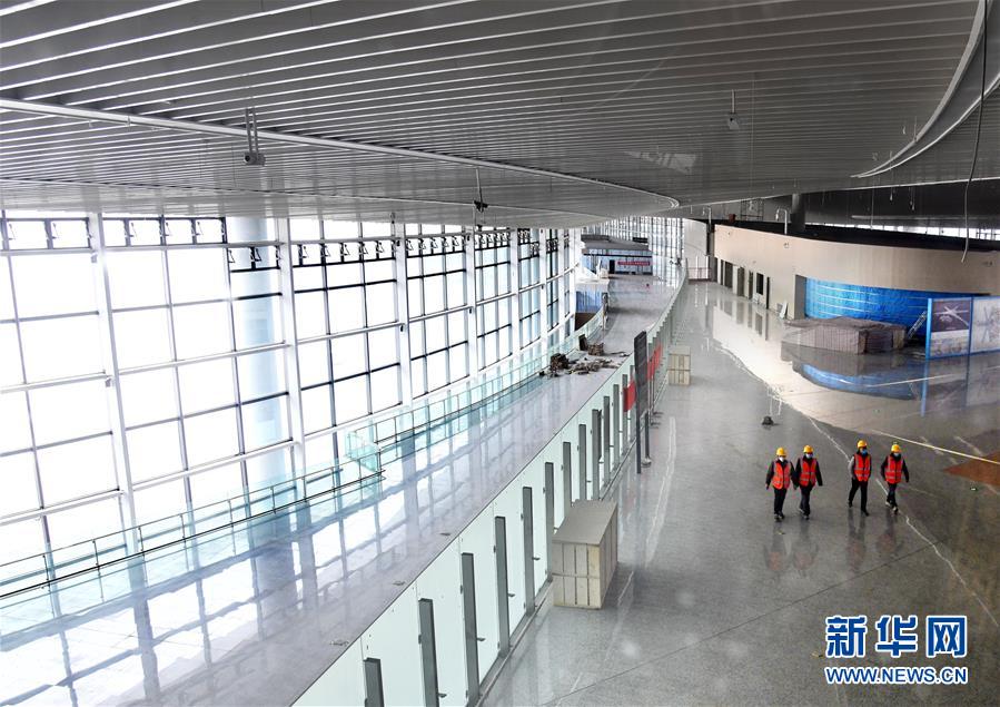 3月25日,幾名工人從建設中的青島膠東國際機場航站樓出發(fā)大廳走過。新華社記者李紫恒攝