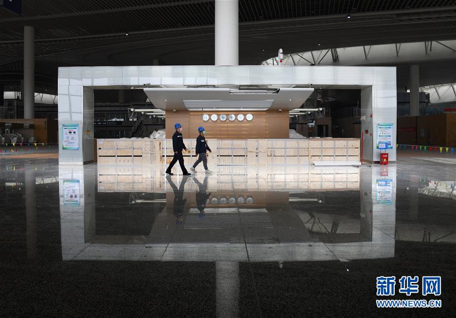 3月25日,兩名工人從建設中的青島膠東國際機場航站樓出發(fā)大廳走過。新華社記者李紫恒攝