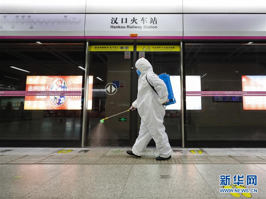 3月23日,在漢口火車站地鐵站,保潔人員在為站廳乘客通道消毒。目前,武漢城市功能和市民生活正逐步有序恢復(fù),地鐵、公交車系統(tǒng)已啟動(dòng)全面消殺和張貼乘客健康二維碼識別等舉措,為恢復(fù)運(yùn)營做準(zhǔn)備。新華社記者沈伯韓攝