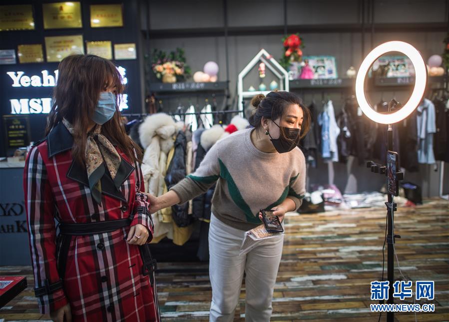 3月29日,在漢口北市場(chǎng),主播在直播平臺(tái)直播銷(xiāo)售一款服裝。新華社記者肖藝九攝