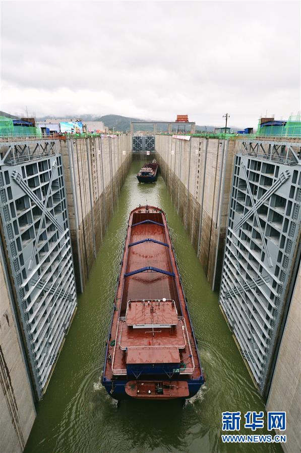 3月31日,船只??吭诖筇賺{水利樞紐工程船閘閘室。新華社記者崔博文攝