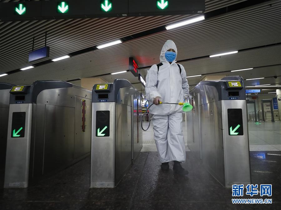 3月23日,在漢口火車站地鐵站,保潔人員在為站廳消毒。新華社記者沈伯韓攝