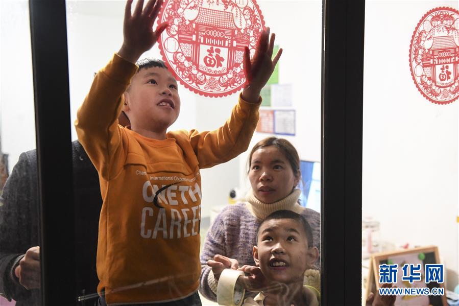 廣西興業(yè)縣搬遷群眾胡紅君(后右)的兒子在新居內(nèi)貼窗花(2020年1月20日攝)。新華社記者曹祎銘攝