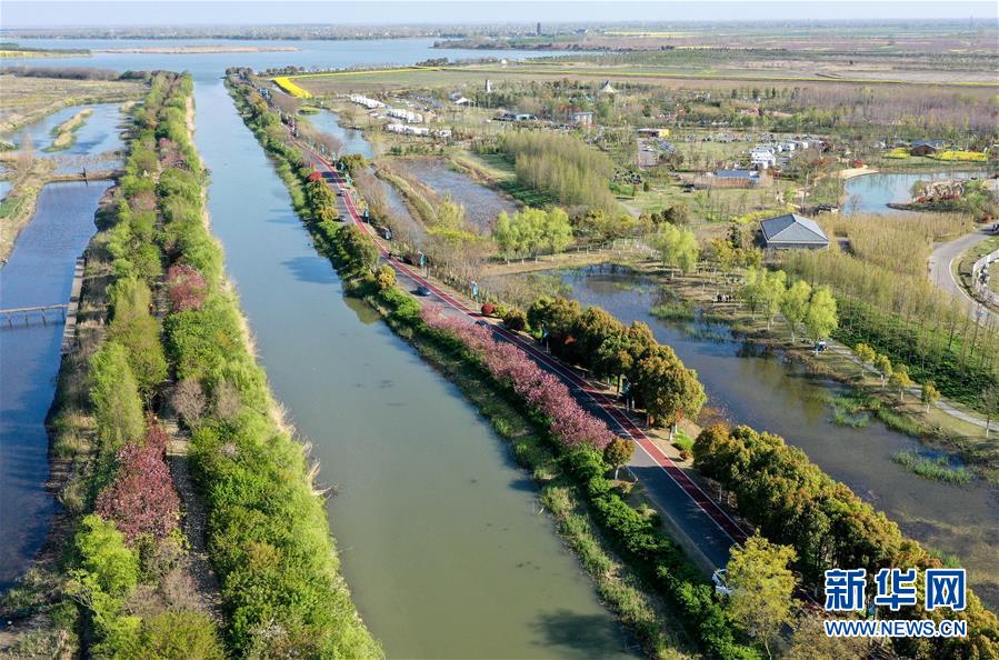 這是4月5日拍攝的白馬湖畔春日景象(無人機照片)。 新華社記者 楊磊 攝