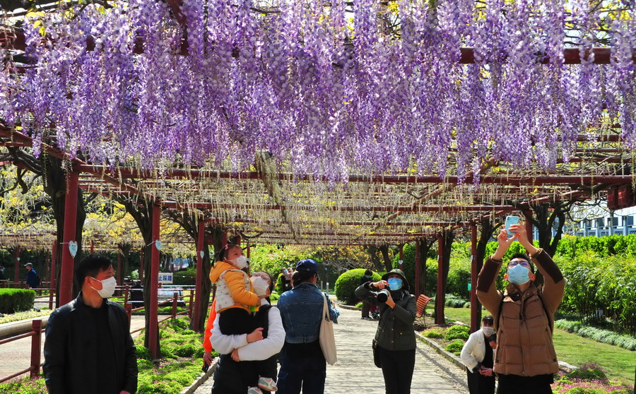 2020年4月5日,上海,每年的4月上旬至5月初是觀賞紫藤花的最佳時期。清明小長假里,晴好天氣使嘉定紫藤園迎來了不少市民游客。今年的紫藤公園采取提前預(yù)約和亮相綠色隨申碼的舉措入園賞花。公園擁有26個品種的紫藤花,盛開時期的紫藤花穗最長可達1米多?;ㄉ凶?,粉,白等,形成的花瀑宛若一簾幽夢,雅致春意今人流連忘返。