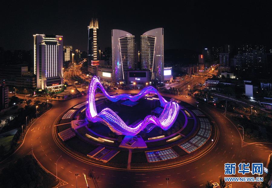 4月7日,武漢光谷環(huán)島開啟燈光秀(無人機(jī)照片)。新華社記者李賀攝