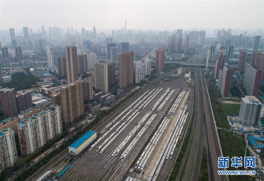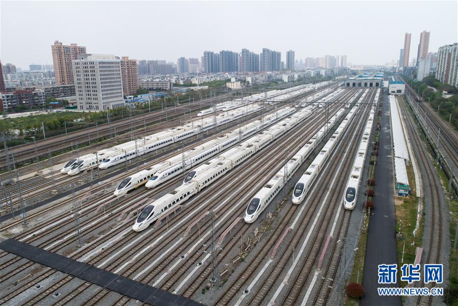 4月7日,在武漢動(dòng)車(chē)段,列車(chē)??吭诖孳?chē)線上(無(wú)人機(jī)照片)。新華社記者 沈伯韓 攝