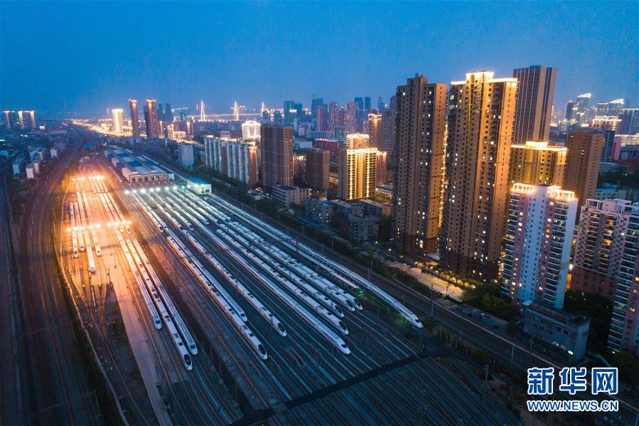 4月7日,在武漢動(dòng)車(chē)段,列車(chē)??吭诖孳?chē)線上(無(wú)人機(jī)照片)。
