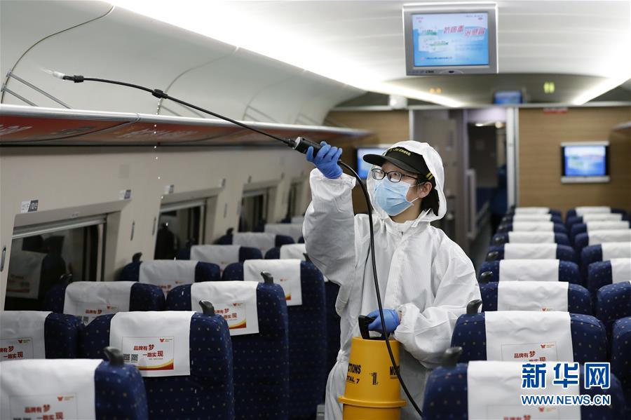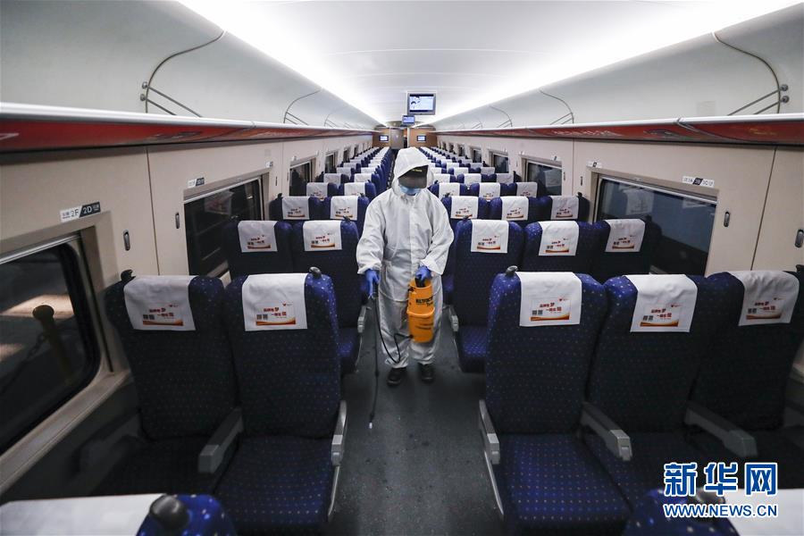 4月7日,武漢動(dòng)車(chē)段運(yùn)用車(chē)間工作人員周明輝在給列車(chē)消毒。 新華社記者 沈伯韓 攝