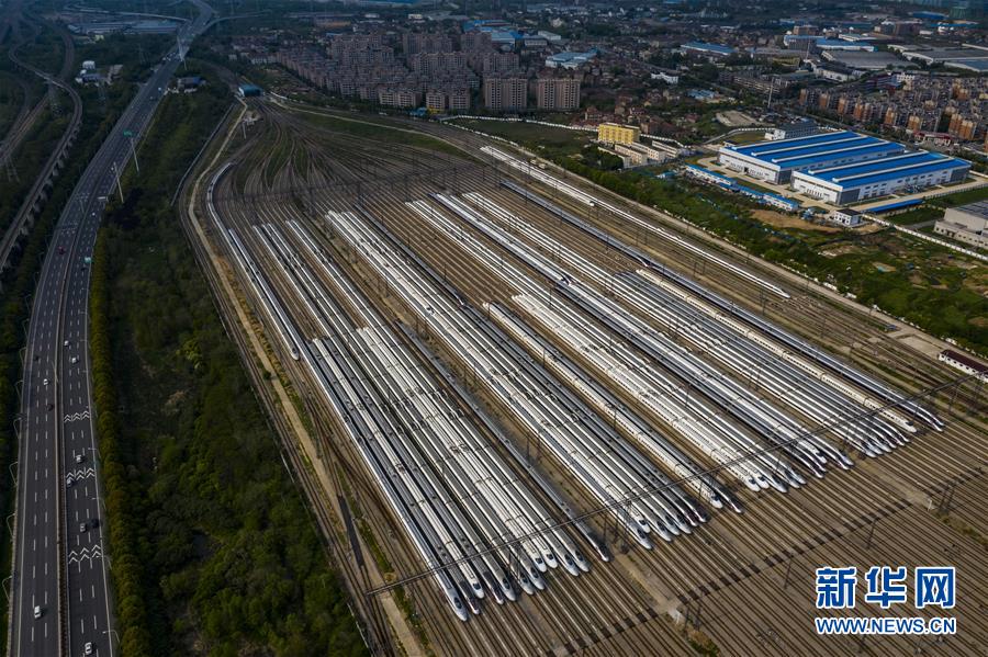 4月7日,在武漢動(dòng)車(chē)段,列車(chē)停靠在存車(chē)線上(無(wú)人機(jī)照片)。新華社記者 沈伯韓 攝