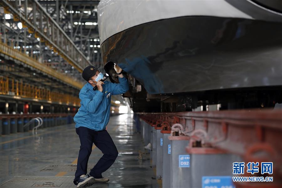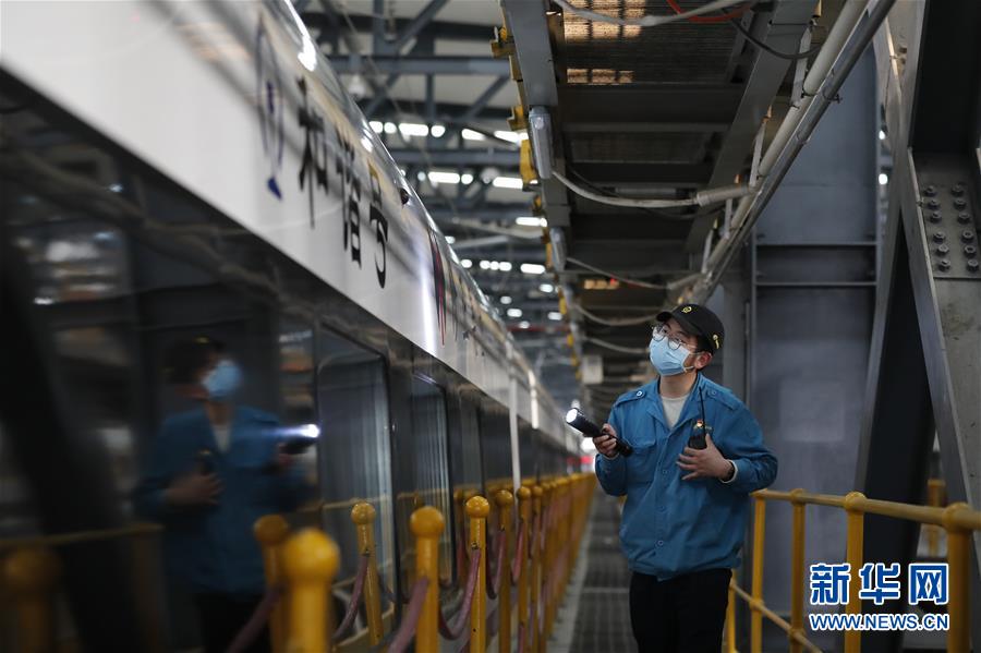 4月7日,武漢動(dòng)車(chē)段運(yùn)用車(chē)間綜合檢修班工長(zhǎng)楊磊在檢查車(chē)輛情況。 新華社記者 沈伯韓 攝