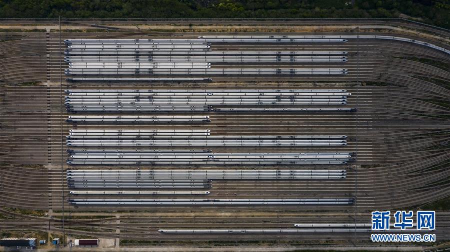 4月7日,在武漢動(dòng)車(chē)段,列車(chē)停靠在存車(chē)線上(無(wú)人機(jī)照片)。 新華社記者 肖藝九 攝
