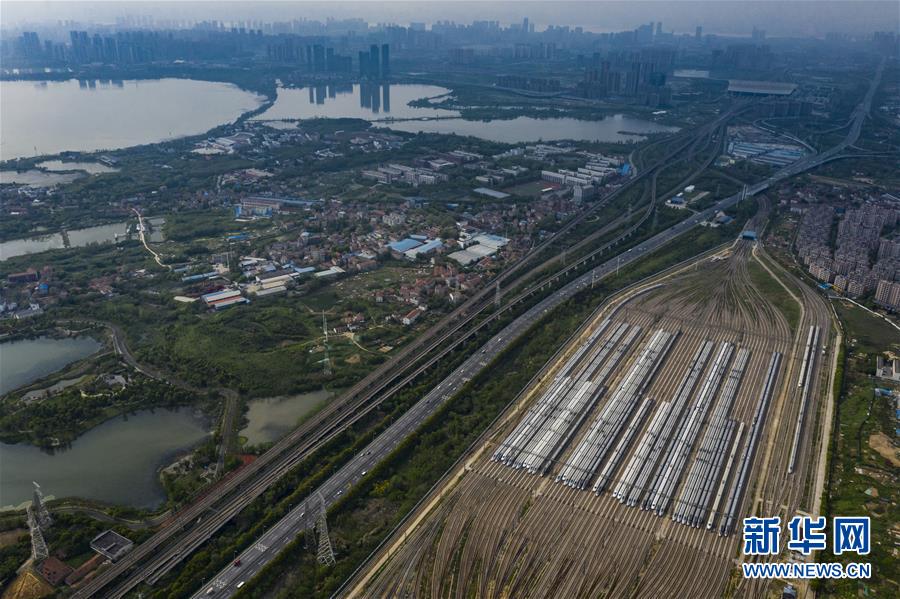 4月7日,在武漢動(dòng)車段,列車??吭诖孳嚲€上(無人機(jī)照片)。新華社記者 沈伯韓 攝