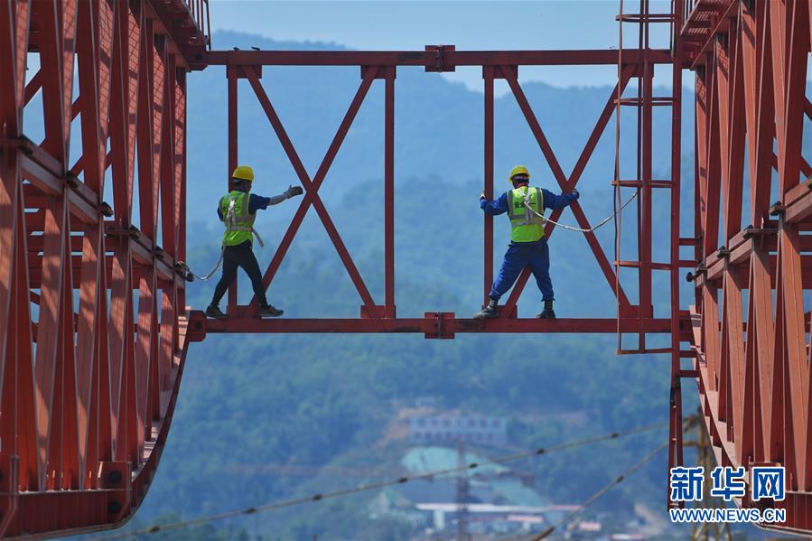 3月5日,工人在中老鐵路南溪河特大橋上施工。新華社記者江文耀攝
