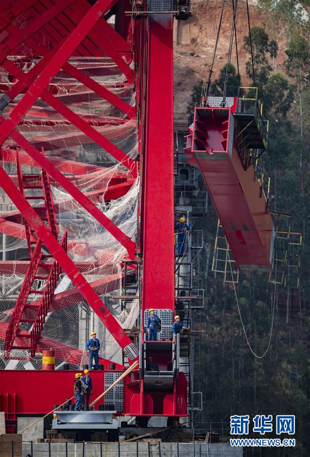 4月8日,中鐵四局的工人們進行鋼桁梁架設(shè)作業(yè)。新華社記者江文耀攝