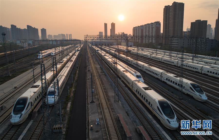 4月8日,在武漢動(dòng)車段,列車停靠在存車線上準(zhǔn)備投入運(yùn)行(無人機(jī)照片)。新華社記者肖藝九攝