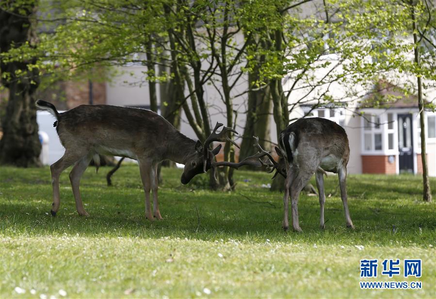 4月8日,在英國(guó)倫敦東部一個(gè)居民區(qū),附近公園里的鹿在草坪上駐足。隨著新冠疫情在英國(guó)的擴(kuò)散,政府要求人們減少不必要的外出。倫敦東部一個(gè)居民區(qū)附近公園里原來(lái)散養(yǎng)的鹿紛紛從公園走出來(lái),或吃草或接受附近居民的喂食,成為特殊時(shí)期居民區(qū)里的新“客人”。新華社記者韓巖攝