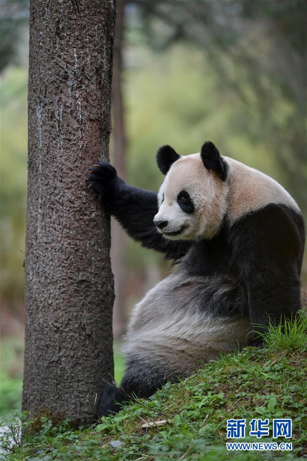 4月14日,大熊貓“喜妹”在中國大熊貓保護(hù)研究中心核桃坪基地活動場內(nèi)。新華社記者張超群攝