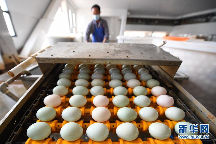 江蘇高郵鴨集團(tuán)的工作人員將腌制好的鴨蛋放到塑封包裝流水線(xiàn)上(4月15日攝)。“高郵鴨蛋”是江蘇高郵的特色農(nóng)業(yè)名片。近年來(lái),當(dāng)?shù)卦诹挤N繁育、生態(tài)養(yǎng)殖、產(chǎn)品加工等方面加大力度,推動(dòng)高郵鴨蛋品牌化建設(shè),讓小鴨蛋成為帶動(dòng)農(nóng)戶(hù)致富的大產(chǎn)業(yè)。2019年,高郵市共計(jì)生產(chǎn)熟制鴨蛋產(chǎn)品近11.2億枚,年產(chǎn)值近17.68億元。新華社記者李博攝