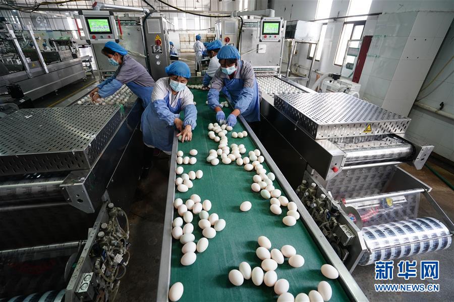 4月15日,在江蘇高郵鴨集團,工人在生產(chǎn)線上忙碌?!案哙]鴨蛋”是江蘇高郵的特色農(nóng)業(yè)名片。近年來,當(dāng)?shù)卦诹挤N繁育、生態(tài)養(yǎng)殖、產(chǎn)品加工等方面加大力度,推動高郵鴨蛋品牌化建設(shè),讓小鴨蛋成為帶動農(nóng)戶致富的大產(chǎn)業(yè)。2019年,高郵市共計生產(chǎn)熟制鴨蛋產(chǎn)品近11.2億枚,年產(chǎn)值近17.68億元。新華社記者季春鵬攝
