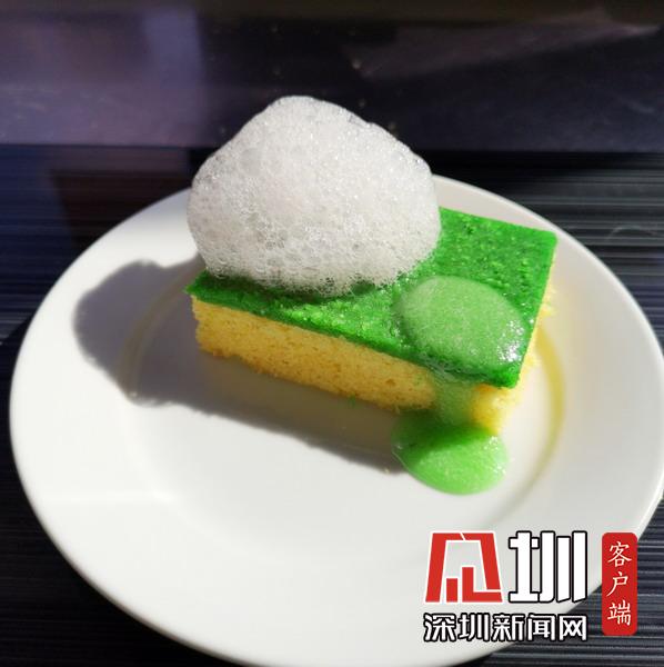 洗碗海綿形狀的蛋糕。其實(shí)是橄欖油蛋糕,上面撒上薄荷面包屑,再配上牛奶泡沫和蘋(píng)果泥。