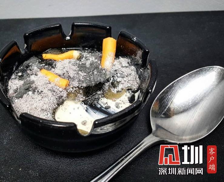 “煙灰缸”奶酪。煙灰缸內(nèi)放置著瓦尼拉蔓越莓慕斯,巧克力還有蛋白粉末制作的煙頭煙灰。
