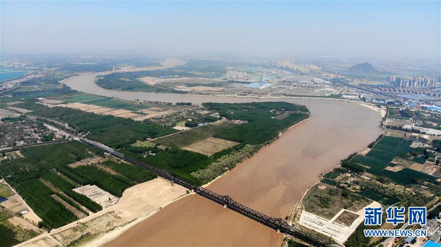4月24日在山東濟南拍攝的黃河景色(無人機照片)。春暖花開的時節(jié),濟南黃河兩岸春風送綠,大河、綠植與城市構(gòu)成了一幅春的畫卷。新華社記者王凱攝