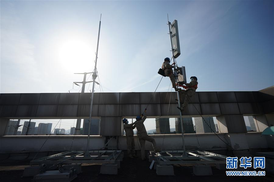 4月25日,在南京220千伏城南河變電站屋頂,工人在架設5G設備。當日,三大通信運營商的2座5G、3座4G基站建設工作在南京220千伏城南河變電站屋頂有序展開。在變電站內(nèi)建設基站可有效利用電網(wǎng)資源,縮短建設周期,節(jié)約建設成本。新華社記者季春鵬攝