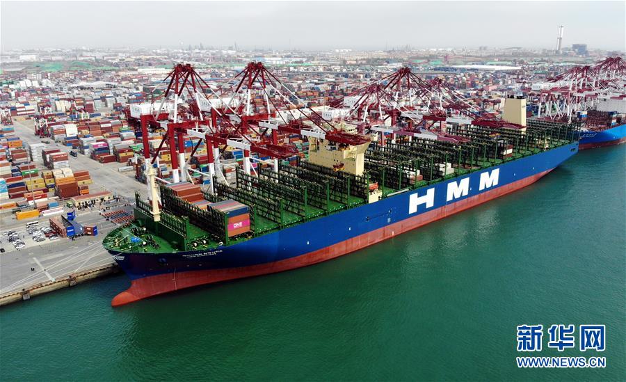 “現(xiàn)代商船阿爾赫西拉斯”輪靠泊在青島港前灣碼頭(無(wú)人機(jī)照片,4月26日攝)。當(dāng)日,載箱量可達(dá)2.4萬(wàn)標(biāo)準(zhǔn)箱的世界最大集裝箱船“現(xiàn)代商船阿爾赫西拉斯”輪從山東青島港開(kāi)啟首航,這條船的甲板面積超過(guò)2.4萬(wàn)平方米,相當(dāng)于3.5個(gè)標(biāo)準(zhǔn)足球場(chǎng)大小。新華社記者李紫恒攝