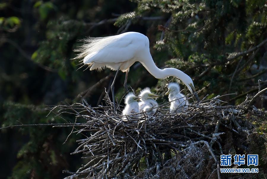在象山森林公園,白鷺和幼鳥在一起(4月26日攝)。近日,在江西省南昌市新建區(qū)象山森林公園內(nèi),已安家筑巢的大批鷺鳥正陸續(xù)孵化后代,一派生機勃勃的景象。新華社記者彭昭之攝