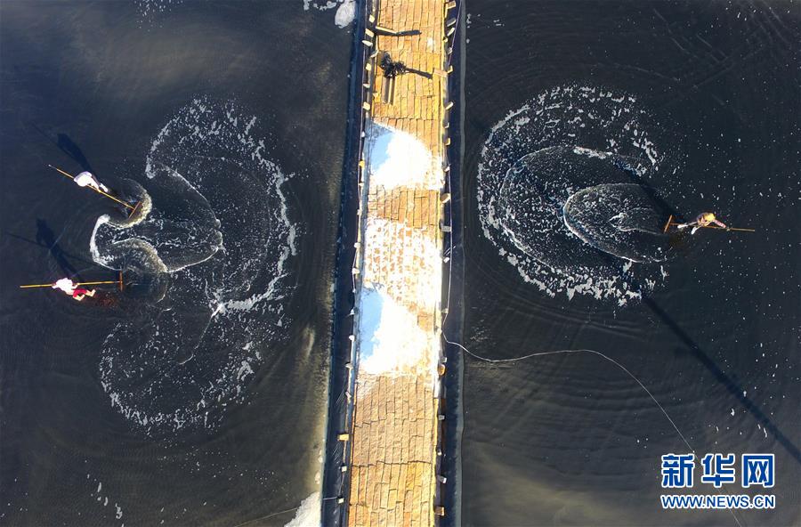 4月27日,莆田鹽場的工人在曬鹽池里忙碌(無人機(jī)照片)。莆田鹽場位于福建省莆田市秀嶼區(qū)東嶠鎮(zhèn),辛勤勞作的鹽工、縱橫交錯(cuò)的曬鹽池,共同構(gòu)成如畫的風(fēng)景。新華社記者魏培全攝