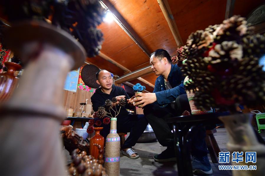 李義成(右)在村民家里了解手工藝品的制作情況(4月26日攝)。新華社記者黃孝邦攝