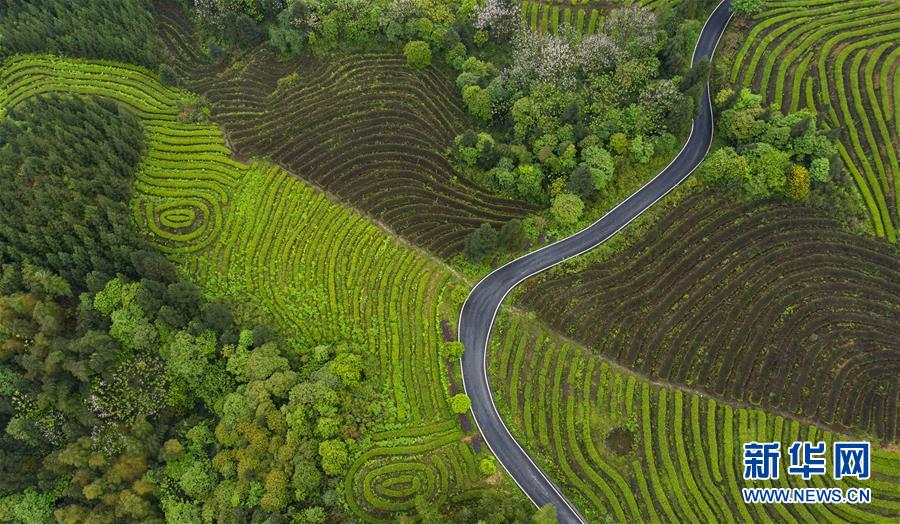 俯瞰鹿鳴茶海一角(4月28日無(wú)人機(jī)照片)。四川省珙縣的鹿鳴茶海,常年云霧繚繞,茶壟依山分布,美不勝收。新華社記者江宏景攝
