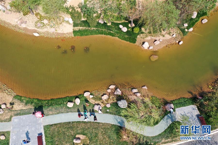 5月1日,游客在河南省鶴壁市淇濱區(qū)鉅橋鎮(zhèn)崗坡村的水系旁游玩(無人機照片)。  新華社記者馮大鵬攝